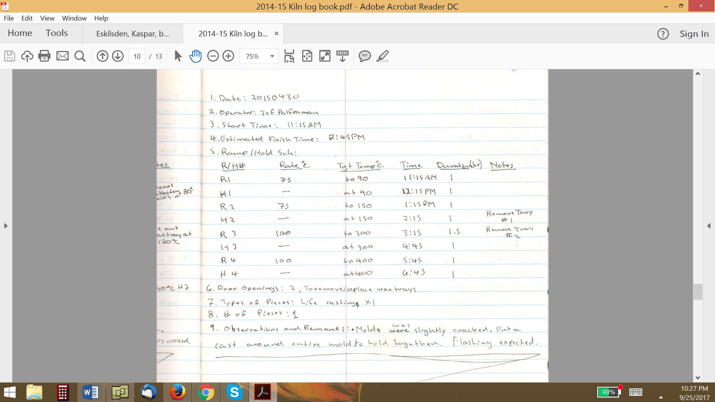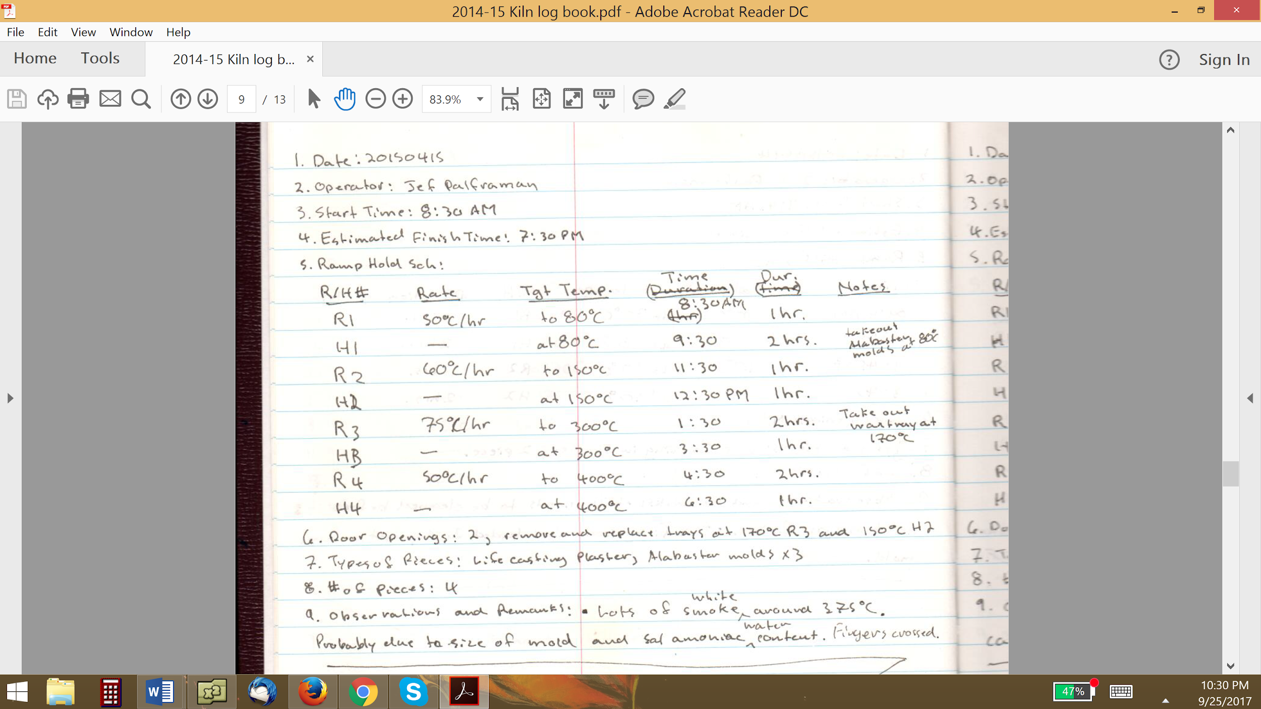 | NJR | 10pm | 11pm | R1 | 50/hr | 80 | 1 hr | We pre-programmed the kiln around 3pm. A 10 hour delay (an overshoot) was added so that we could start the kiln whenever we were ready |